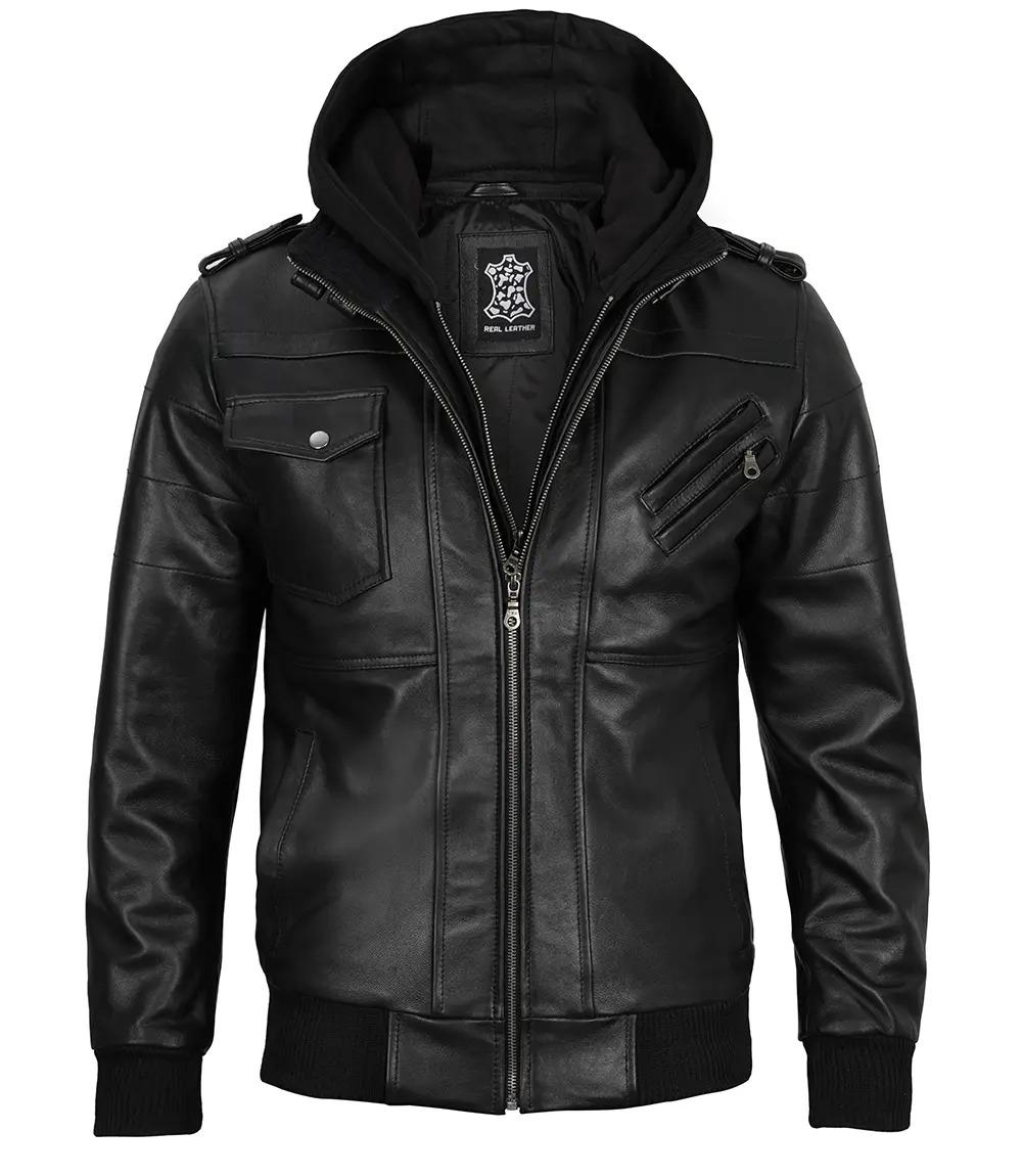 Men`s Black Real Leather Hooded Jackets