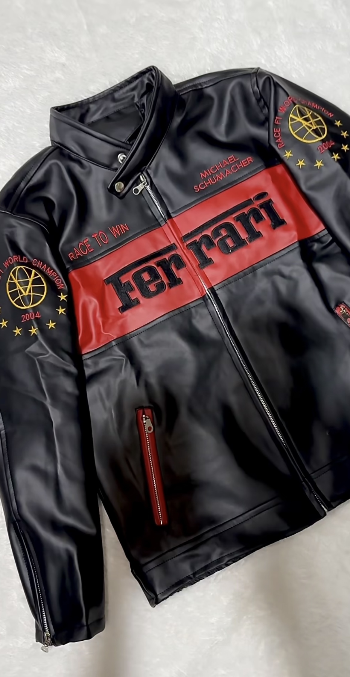 Unleash the speed and legacy of Michael Schumacher with this Ferrari F1 Racing Leather Jacket! Designed for motorsport enthusiasts, this premium black and red leather biker jacket features embroidered Ferrari branding, racing-inspired details, and championship-winning style. Whether you're a Formula 1 fan, a biker, or someone who loves bold statement pieces, this jacket is the ultimate blend of luxury and performance. Own a piece of racing history – shop now and elevate your style!