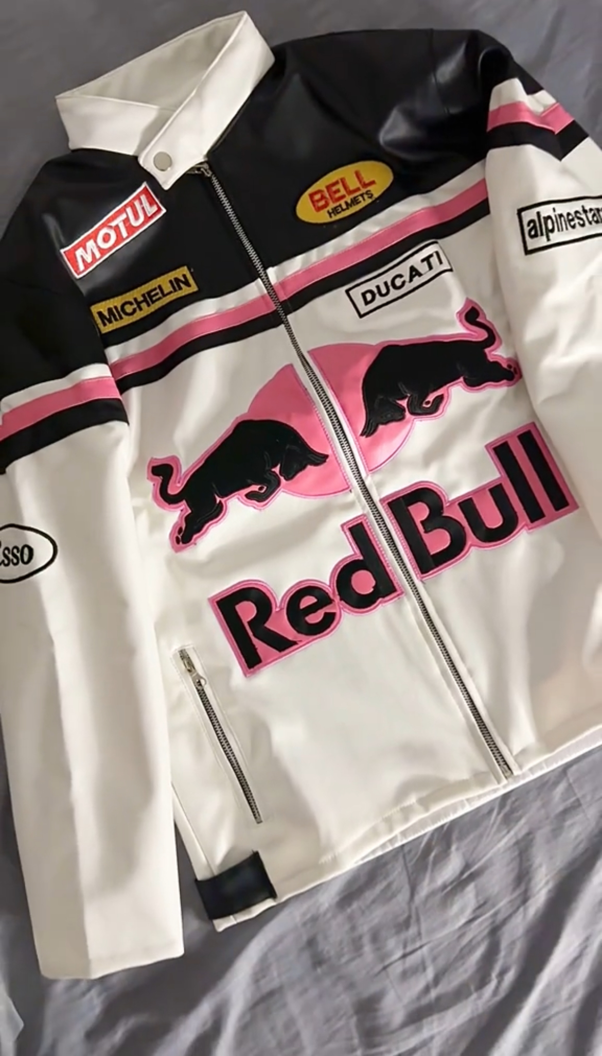 Unleash the thrill of the racetrack with this Red Bull Racing-inspired leather jacket! Designed for bikers, F1 fans, and motorsport lovers, this high-performance MotoGP racing jacket features premium leather, bold black-white-pink styling, and iconic sponsor patches. Whether you're riding or making a statement, this motorcycle jacket delivers speed, style & adrenaline! Limited stock – Order now